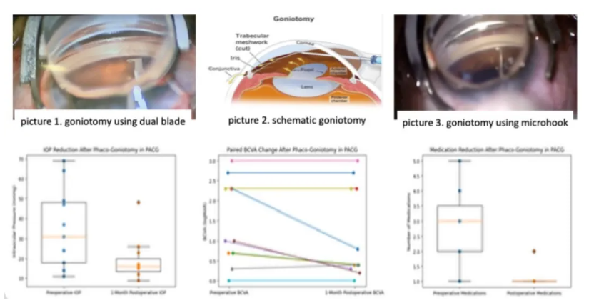PACG是亚洲人群主要的致盲性眼病之一。单纯白内障超声乳化手术通过移除增厚的晶状体,可加深前房、开放房角,但可能无法完全解决小梁网通路的功能性梗阻。房角切开术作为一种微创青光眼手术(MIGS),旨在直接切开小梁网,恢复生理性房水外流。两者联合,理论上可同时解除瞳孔阻滞与解除小梁网阻塞,实现“1+1>2”的协同降压效果。为评估该联合手术的短期疗效,Swadayani团队开展了一项回顾性病例系列研究。该研究纳入11例(11眼)PACG患者,7例女性、4例男性,平均年龄65±9.0岁,多数属晚期病例,术前平均眼压高达34.7±20.2 mmHg,平均使用2.82种降眼压药物。所有患者均接受白内障超声乳化联合房角切开术,术后于第1天、第7天及1个月进行随访。结果显示: