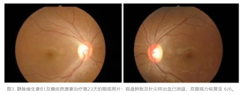 本病例提示,对于存在长期呕吐、营养不良或出现神经系统体征的患者,无论有无饮酒史,均应警惕韦尼克脑病的可能。早期足量补充硫胺素是预防永久性神经与视觉损伤的关键。该病例亦表明,视神经病变虽为韦尼克脑病的罕见表现,但经及时干预通常可逆。综上,在面对此类复杂情况时,跨学科协作与迅速启动针对性治疗至关重要。