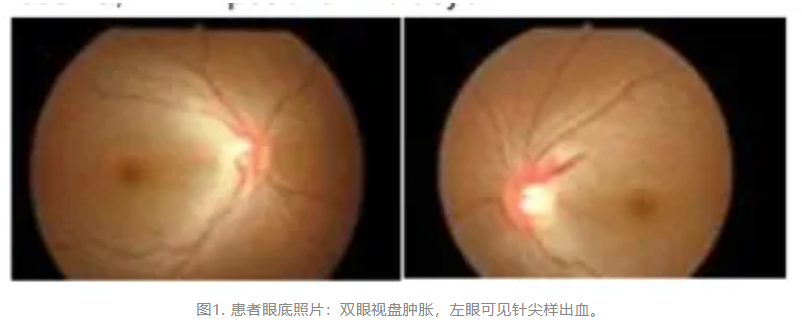 眼科检查提示视力下降,右眼视力6/60(0.1)、左眼视力6/12(0.5),伴有双侧水平性眼震,眼底可见双侧视盘水肿,左眼相对性传入性瞳孔障碍(RAPD)阳性,眼前节检查未见明显异常。