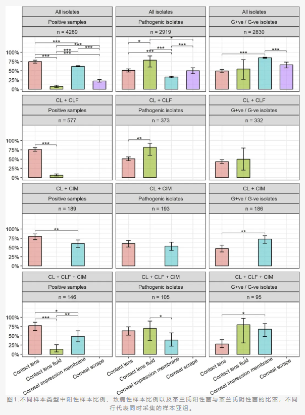 为了评估接触镜及其保存液培养在疑似微生物性角膜炎病例中分离明确病原体的检出率,研究团队对2012年1月至2023年12月期间,在皇家利物浦大学医院收集的4298例微生物性角膜炎眼部标本数据进行了回顾性分析。研究比较了角膜印记膜、角膜刮片、接触镜及其保存液在病原体检出率及明确病原体构成比方面的差异,并采用卡方检验和混合效应逻辑回归模型评估了各类样本中分离株的分布特征。