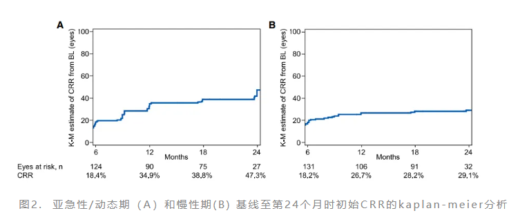 LEROS研究作为艾地苯醌(每天900mg)精准应用的关键循证支撑,通过前瞻性、开放标签、国际多中心IV期设计,创新性纳入症状发作后1-5年的LHON患者,并与匹配的自然史对照组对比,明确了长期治疗的持续获益:在亚急性/动态期(发病≤12个月),治疗12个月后临床相关获益(CRB)率达42.3%(vs. 自然史组20.7%,P=0.002),24个月时进一步提升至52.9%(vs. 36.0%,P=0.03)。这一优势源于临床稳定率(CRS)显著提升(12个月64.5% vs. 22.5%,P<0.001)及恶化率(CRW)显著降低(12个月29.1% vs. 58.5%,P<0.001;24个月25.8% vs. 51.0%,P=0.005),提示艾地苯醌长期干预可多维度保护视功能。更为关键的是,LEROS研究首次通过与大样本自然史队列的对比,提供了高级别的循证证据,表明在慢性期(发病>1年)启动艾地苯醌治疗,患者仍有可能获得显著的视力恢复,这挑战了传统的‘慢性期治疗无效’的认知:12个月CRB率达50.3%,24个月仍维持49.1%,且临床相关恢复率(CRR)随时间累积,同时CRW率显著下降。同时,Kaplan-Meier生存分析(图2)为治疗持续性价值提供了关键佐证,直观揭示了无论患者处于亚急性/动态期还是慢性期,CRR均随治疗时长的延长呈现持续累积趋势。