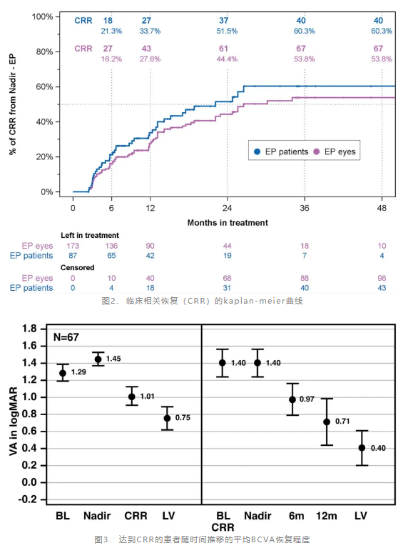 临床相关恢复(CRR)率:46.0%(40/87)的患者出现CRR,这一比例显著高于LHON自然病程中10%–30%的自发恢复率,印证了艾地苯醌可有效激活视神经的修复潜能;首次CRR平均时间为9.5个月,恢复程度随治疗持续时间延长而增加(图2-3)——从首次CRR时的0.45 logMAR提升至最终0.72 logMAR(相当于ETDRS视力表7行以上)。这一结果提示LHON的视神经修复是渐进性过程,长期用药可持续增强艾地苯醌的抗氧化应激与神经保护作用,逐步改善视力功能。