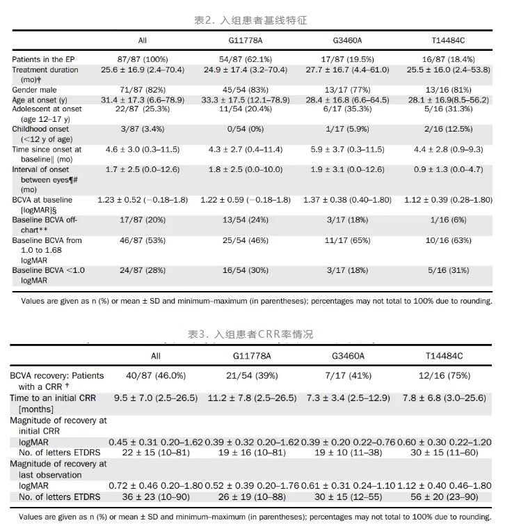 这是一项多中心、回顾性、非对照真实世界研究,纳入2011年至2018年参与EAP的111例LHON患者,所有患者均经基因确诊携带mtDNA突变且症状出现(最近受累眼)≤12个月。治疗方案为艾地苯醌900mg/天(150mg片剂,每日3次),治疗持续时间由临床医师根据患者病情决定。疗效评估采用两项核心指标:CRR定义为从无法辨认ETDRS视力表(>1.68 logMAR)恢复至至少阅读1行(5个字母),或最佳矫正视力(BCVA)改善≥2行(10个字母); CRS定义为基线视力<1.0 logMAR(未达法定失明阈值)的眼睛在随访中维持该视力。安全性评估记录不良事件的类型、严重程度及与治疗的相关性。