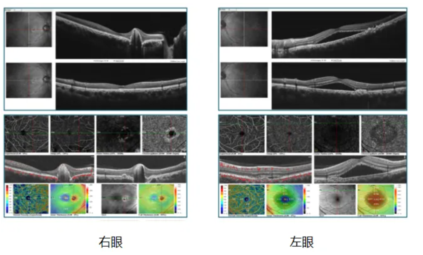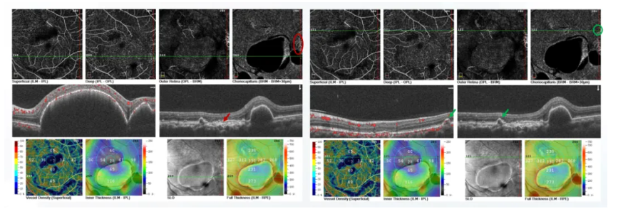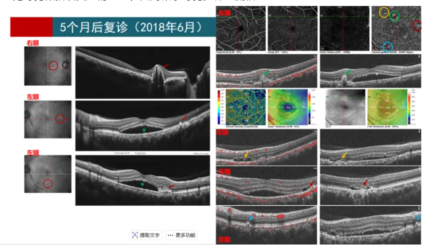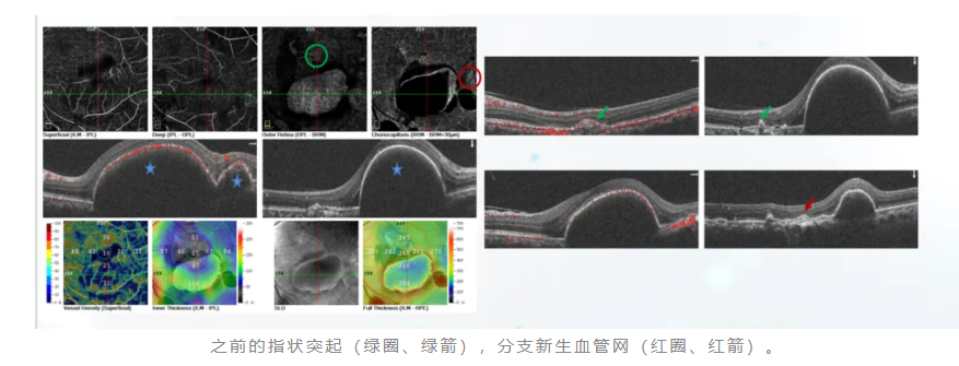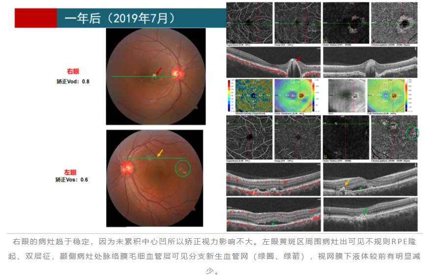 眼科检查见右眼情况趋于稳定,黄斑区结构上较半年前似乎变化不大,但是仍然可见扩张的Haller层及增厚的脉络膜表现。然而左眼可见多处色素上皮改变,其中绿圈、绿箭处可见似指状突起的改变,其间似乎可见少许血流信号。