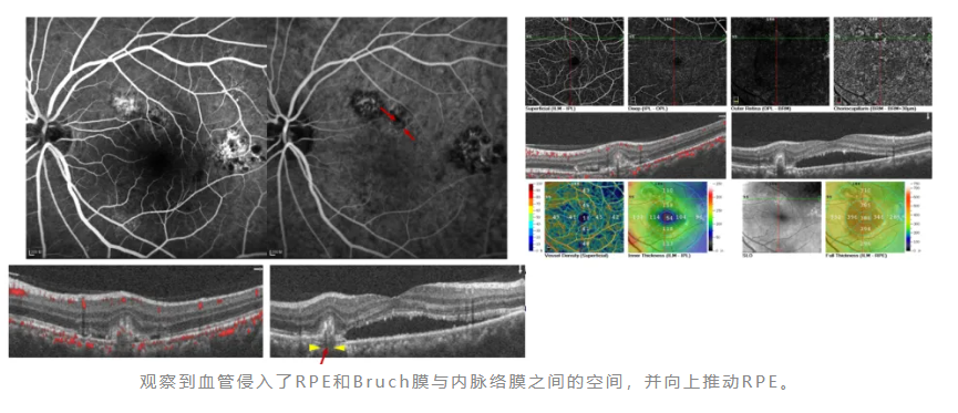 观察到血管侵入了RPE和Bruch膜与内脉络膜之间的空间,并向上推动RPE。