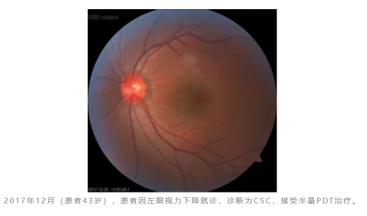 患者为一名44岁男性,因“左眼视力下降1年余”就诊,否认全身特殊慢性病史。右眼曾于2011年10月(患者37岁)诊断为“CSC”,接受半量PDT治疗;左眼于2017年12月(患者43岁)诊断为“CSC”,接受半量PDT治疗。
