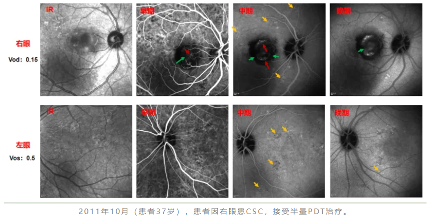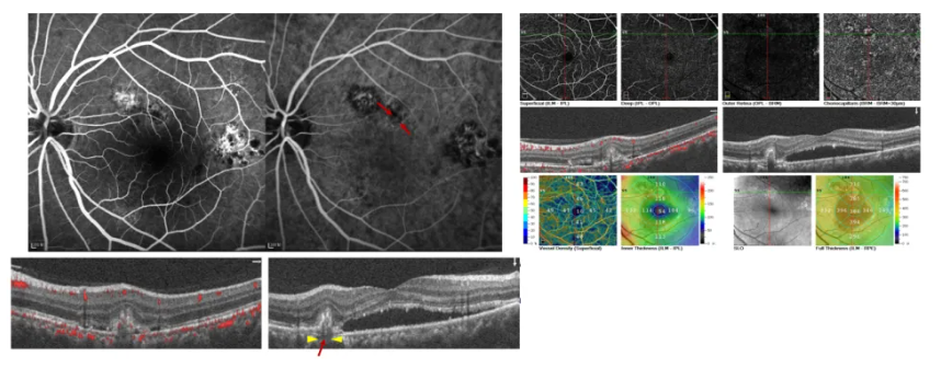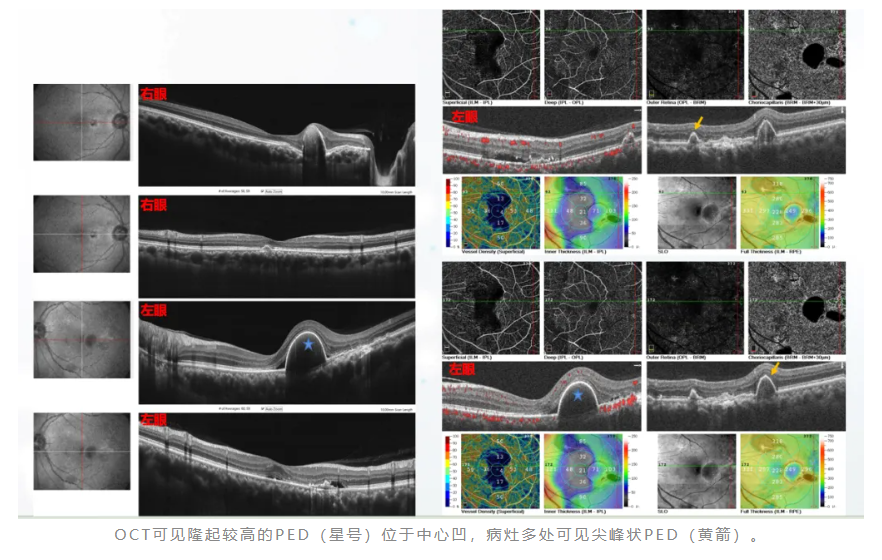 患者左眼发病后,李燕教授团队意识到,该患者原来一开始就是PCV。患者初次右眼发病,年龄为37岁,这相较于通常PCV患者的发病年龄较年轻。右眼已经是陈旧性病灶且无活动性改变,考虑观察;左眼给予球内注药治疗(3针后),但患者后续并未按时复诊。