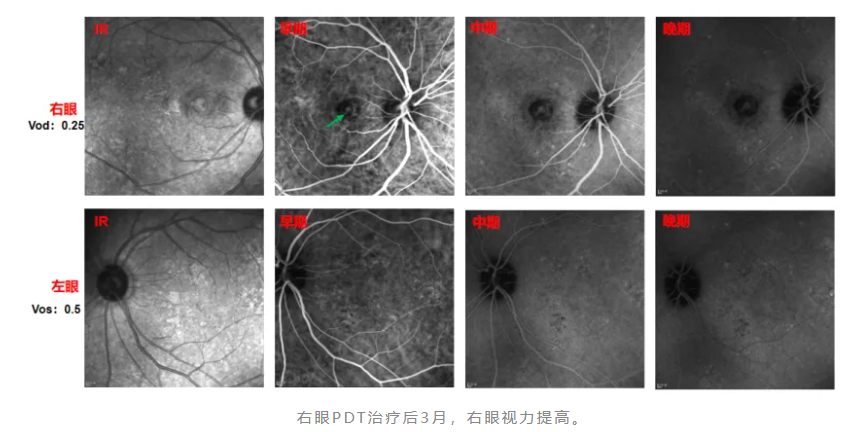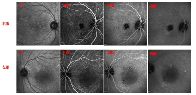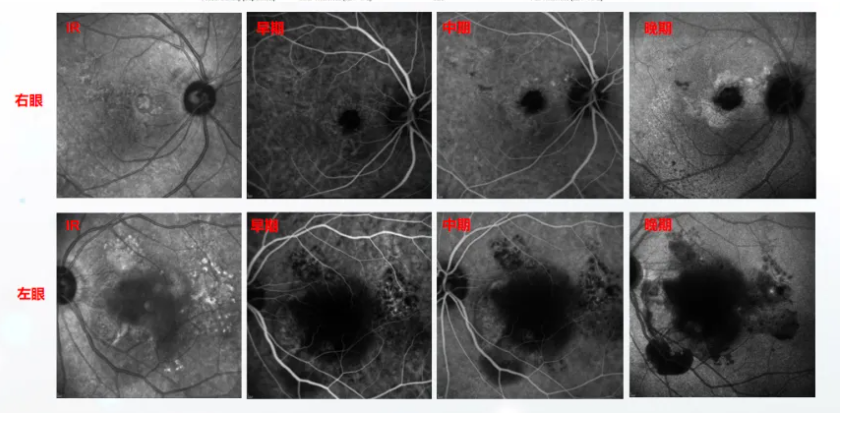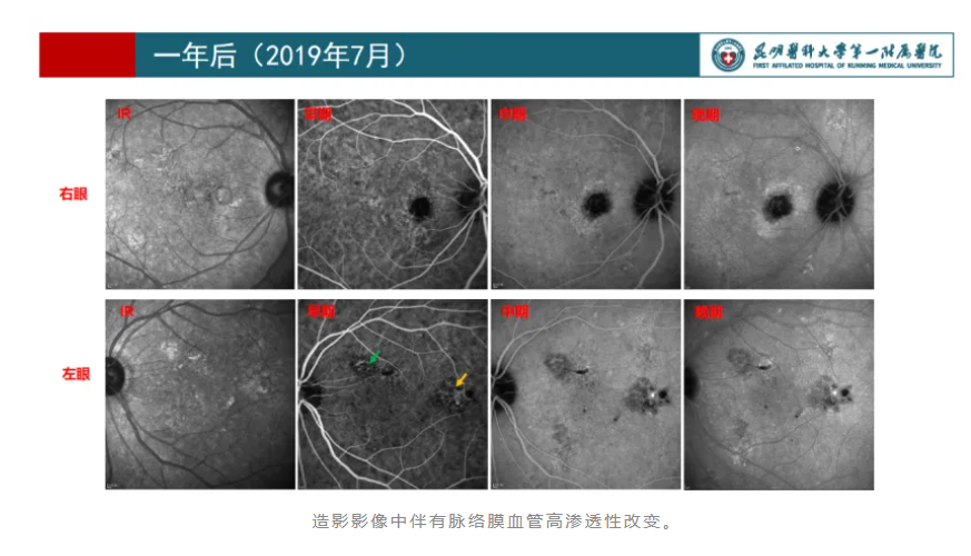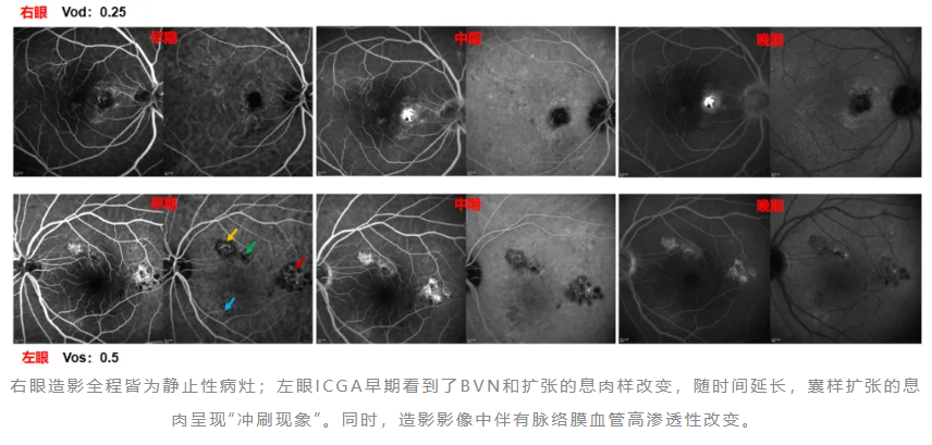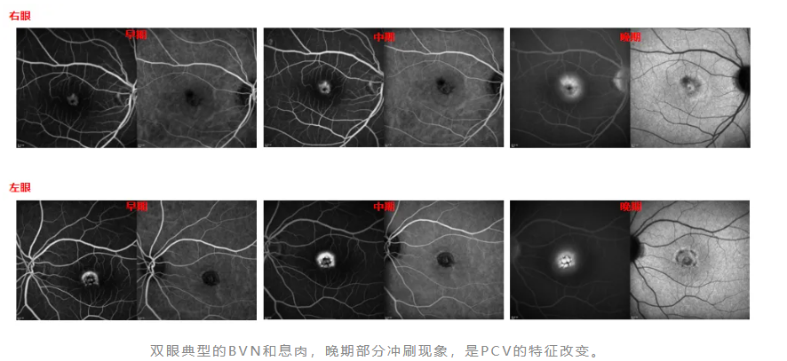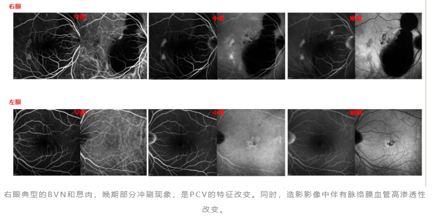 右眼典型的BVN和息肉,晚期部分冲刷现象,是PCV的特征改变。同时,造影影像中伴有脉络膜血管高渗透性改变。