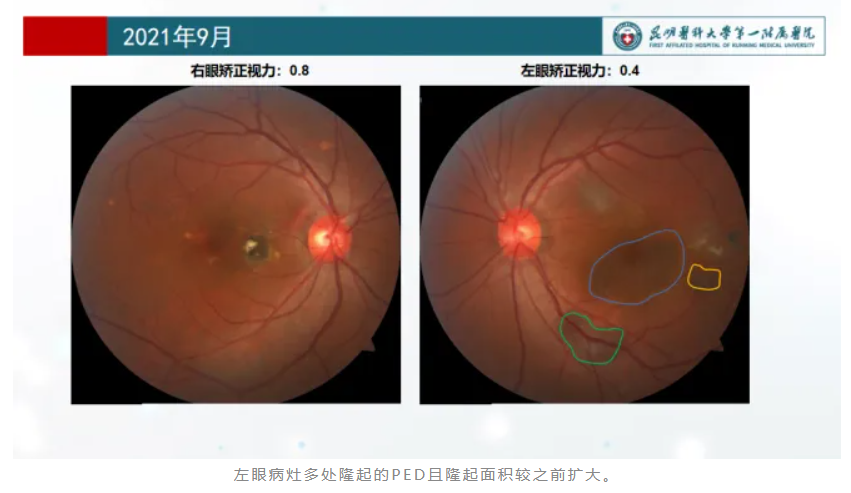 左眼病灶多处隆起的PED且隆起面积较之前扩大。