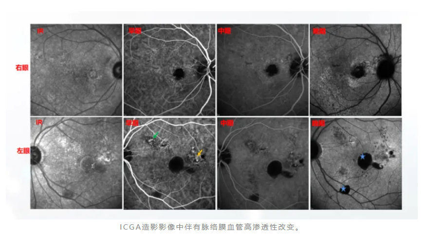 为了弄清楚这个问题,李燕教授团队追问患者详细病史及检查其既往检查资料,发现既往右眼初次发病的ICGA资料提示,右眼初次发病已出现PCV病理改变(绿箭:BVN,红箭:息肉)。同时,造影影像中伴有脉络膜血管高渗透性改变。